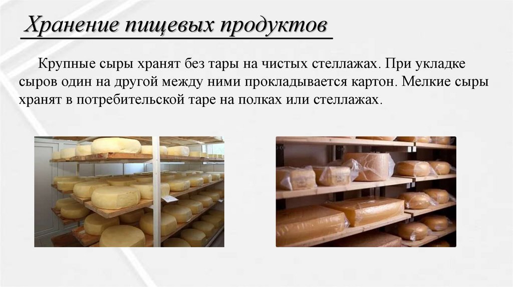 Хранение пищевых продуктовКрупные сыры хранят без тары на чистых стеллажах. При укладке