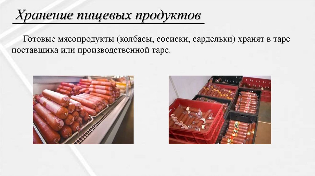 Хранение пищевых продуктовГотовые мясопродукты (колбасы, сосиски, сардельки) хранят в таре