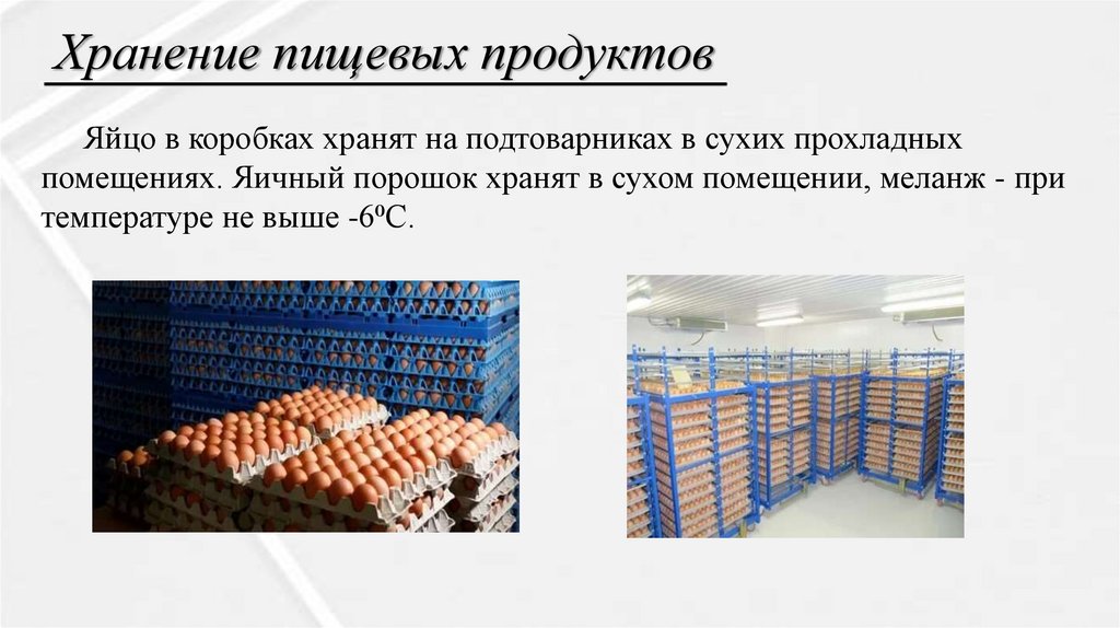 помещениях. Яичный порошок хранят в сухом помещении, меланж - при