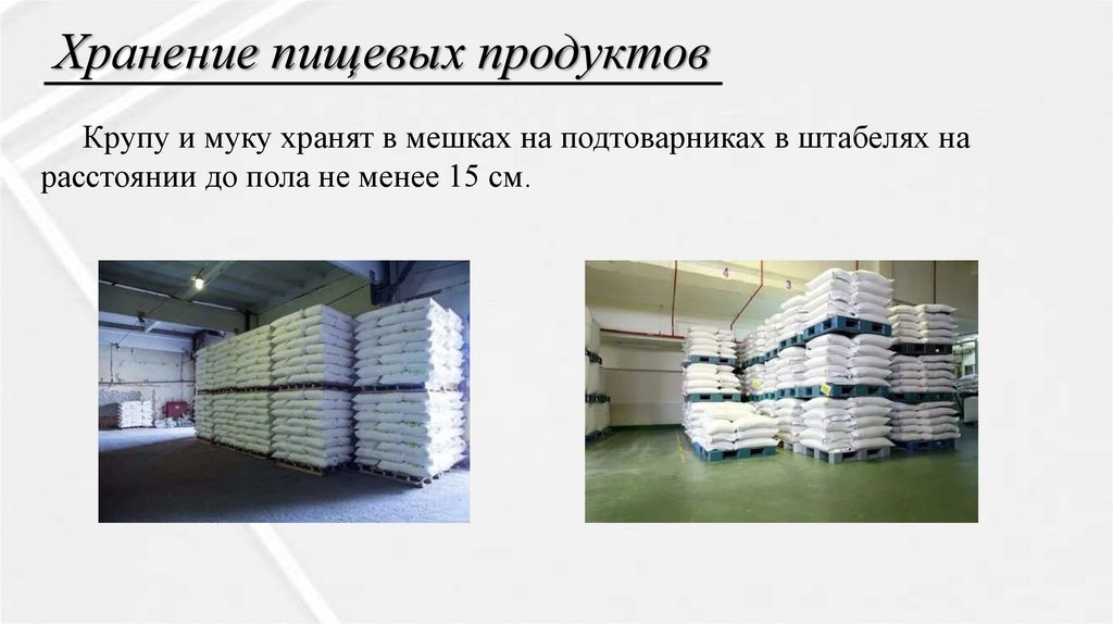 Хранение пищевых продуктовКрупу и муку хранят в мешках на подтоварниках в штабелях на