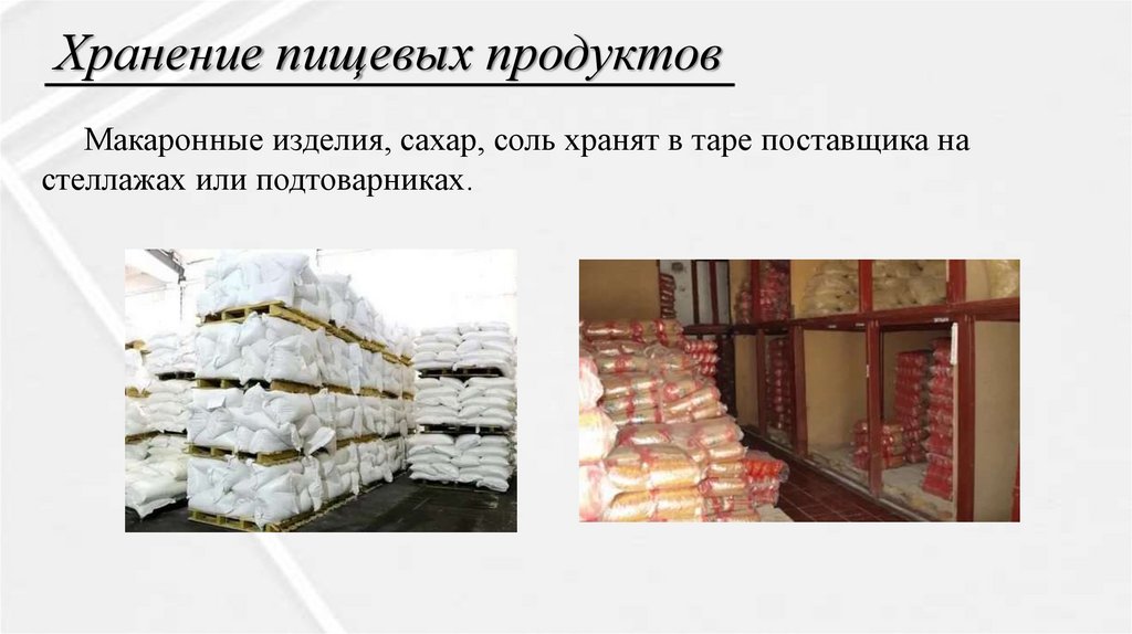 Хранение пищевых продуктовМакаронные изделия, сахар, соль хранят в таре поставщика на