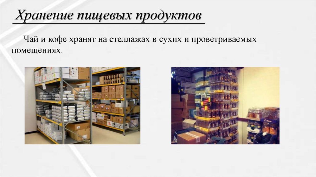 Хранение пищевых продуктовЧай и кофе хранят на стеллажах в сухих и проветриваемых