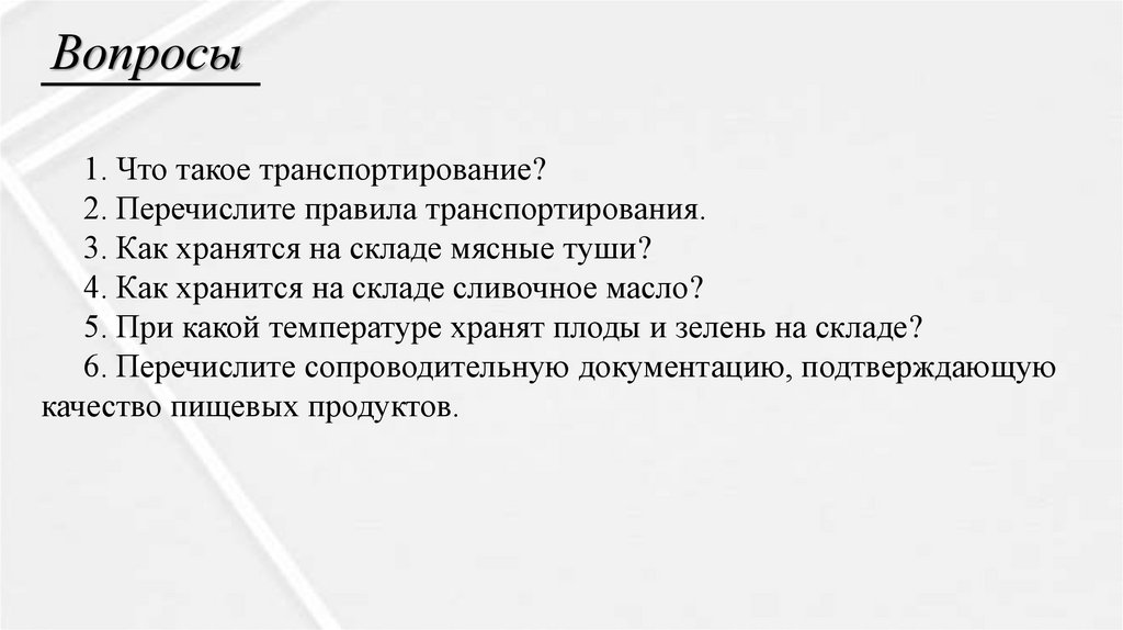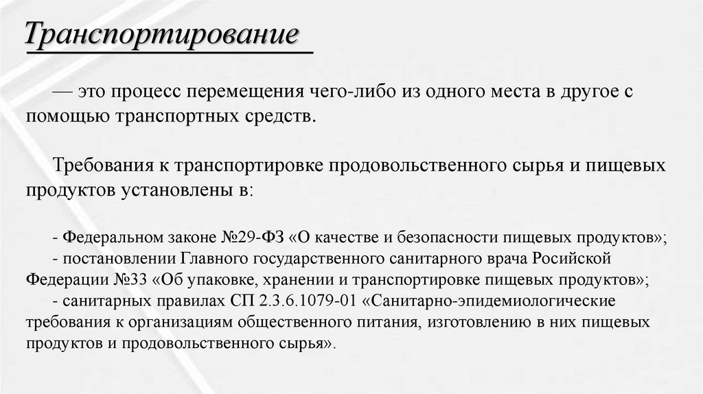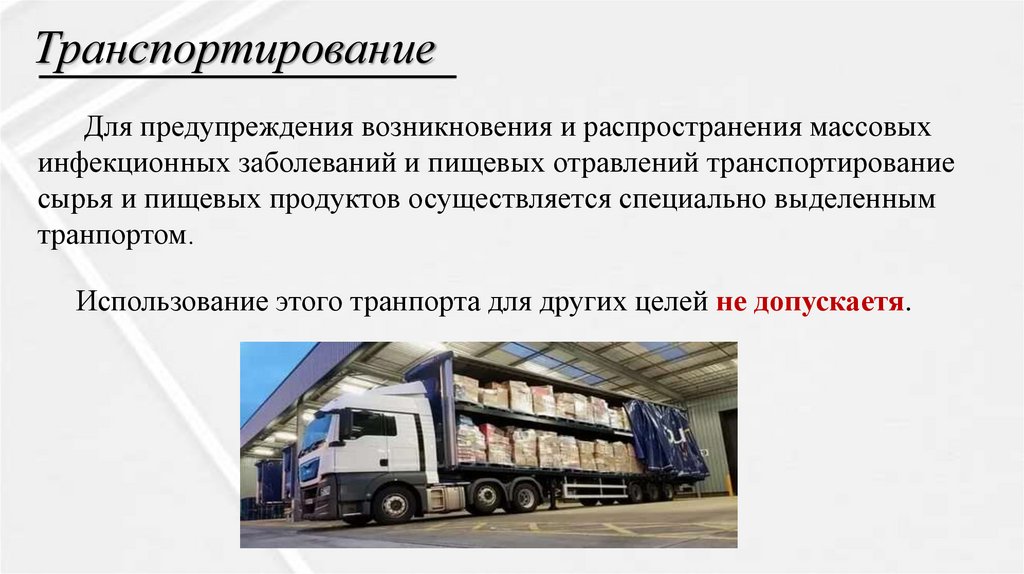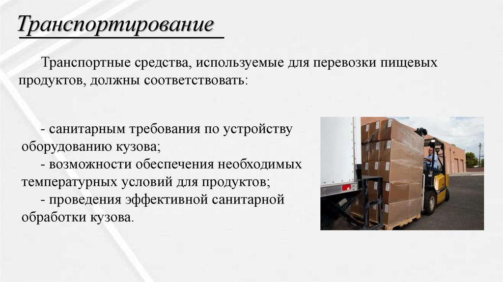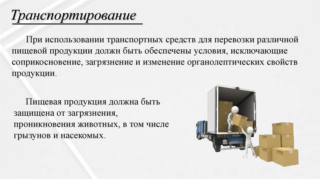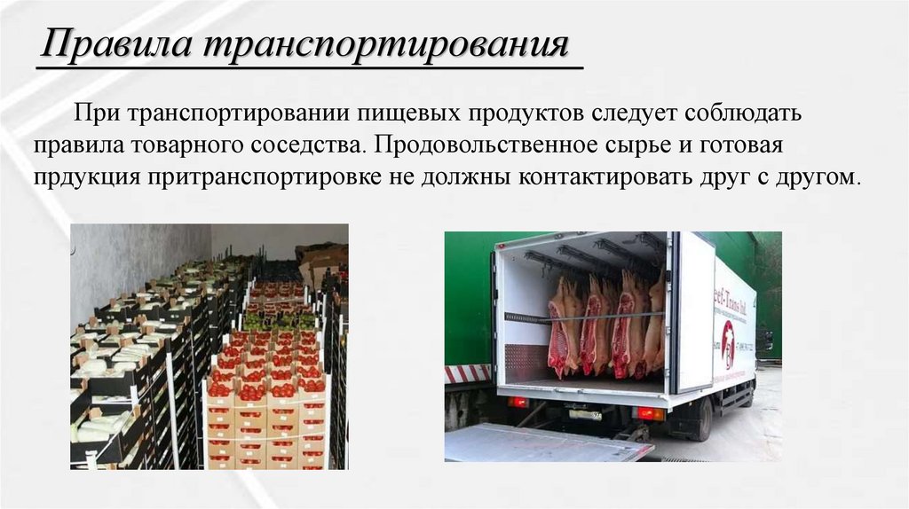 Правила транспортированияПри транспортировании пищевых продуктов следует соблюдать