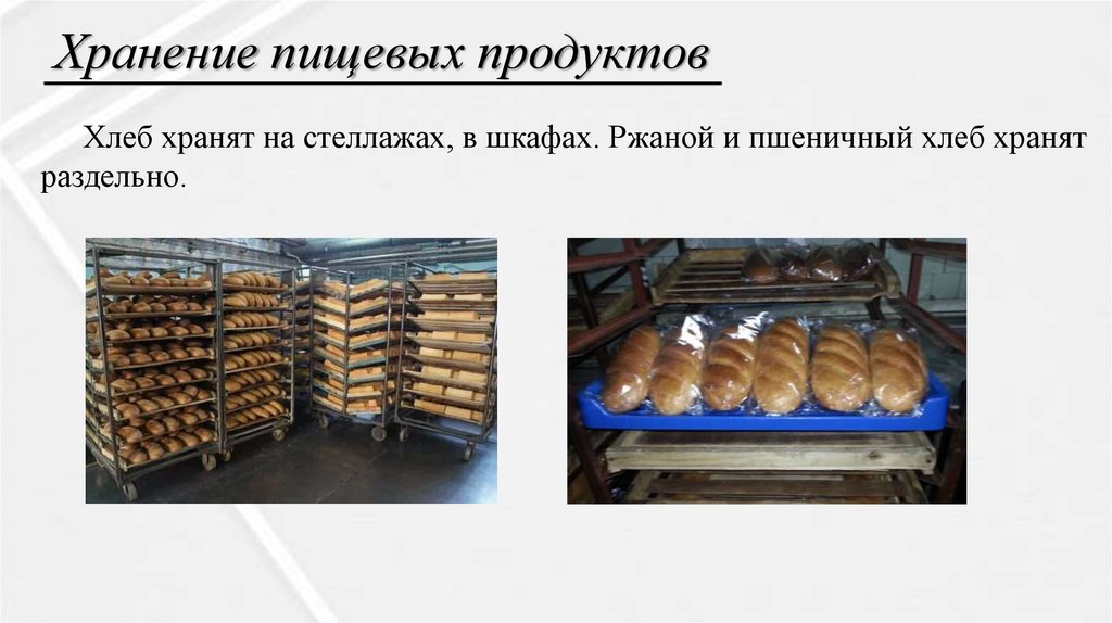 Хранение пищевых продуктовХлеб хранят на стеллажах, в шкафах. Ржаной и пшеничный хлеб хранят