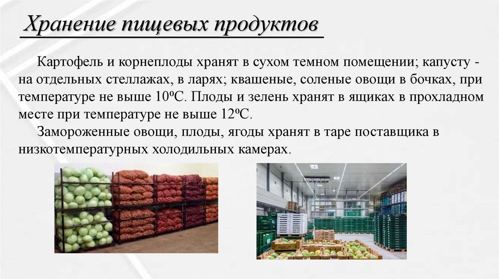 Хранение пищевых продуктовКартофель и корнеплоды хранят в сухом темном помещении; капусту на отдельных стеллажах, в ларях; квашеные, соленые овощи в бочках, при