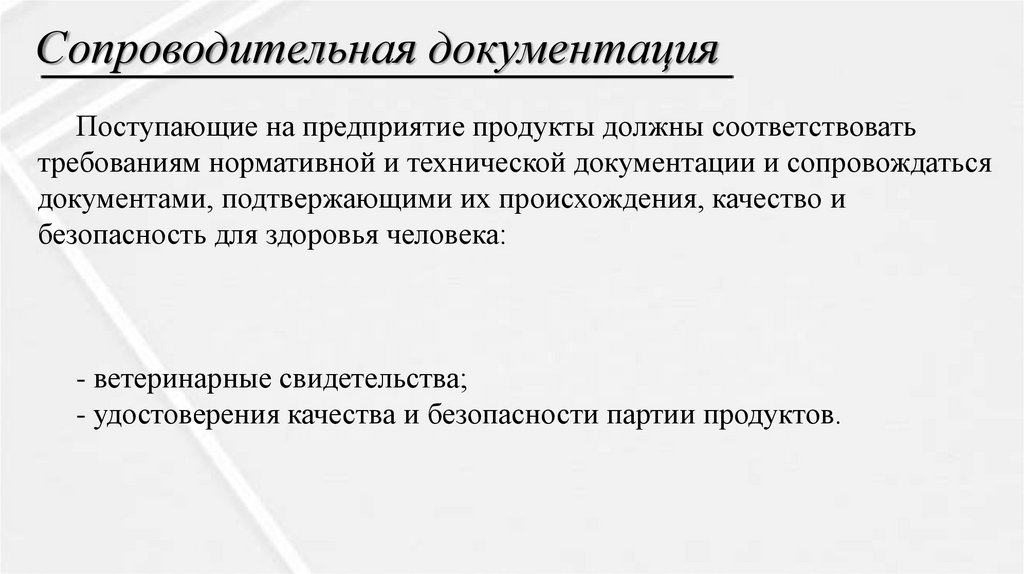 Сопроводительная документацияПоступающие на предприятие продукты должны соответствовать