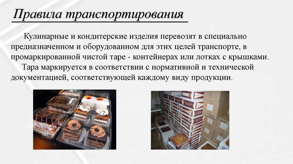 Правила транспортированияКулинарные и кондитерские изделия перевозят в специально