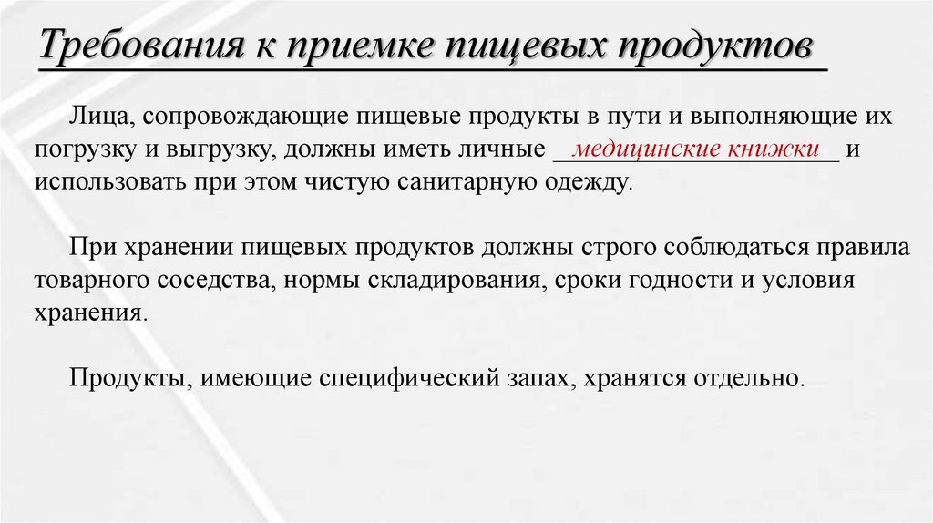 Требования к приемке пищевых продуктовЛица, сопровождающие пищевые продукты в пути и выполняющие их