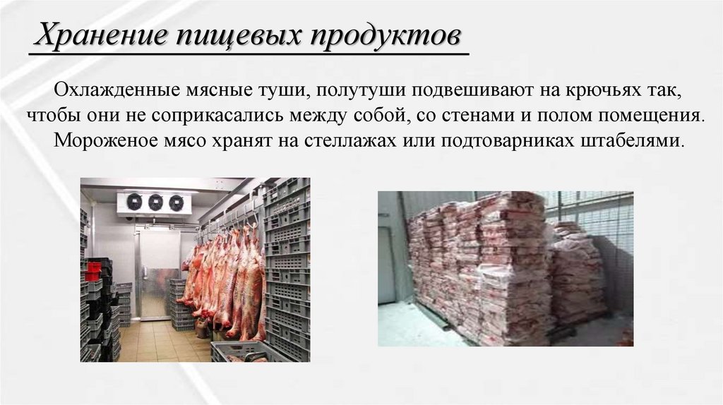 Хранение пищевых продуктовОхлажденные мясные туши, полутуши подвешивают на крючьях так,
