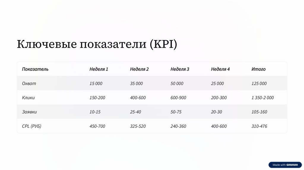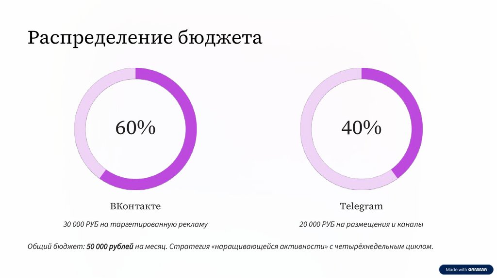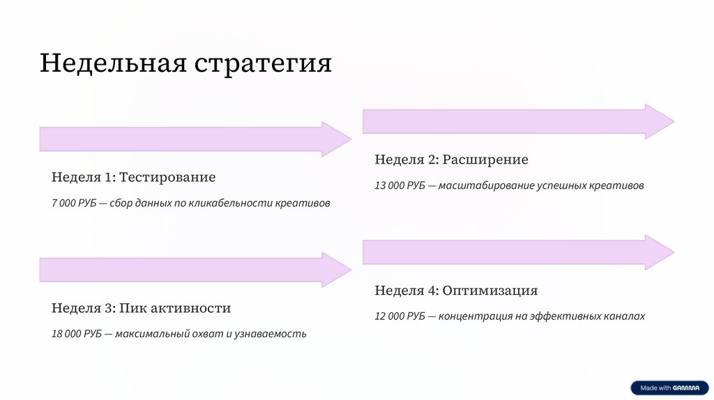 Общий бюджет: 50 000 рублей на месяц. Стратегия «наращивающейся активности» с четырёхнедельным циклом.