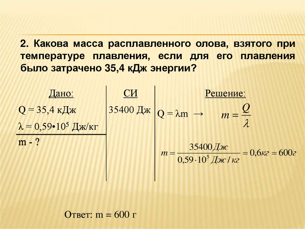 2. Какова масса расплавленного олова, взятого притемпературе плавления, если для его плавления