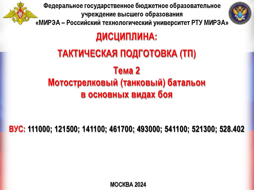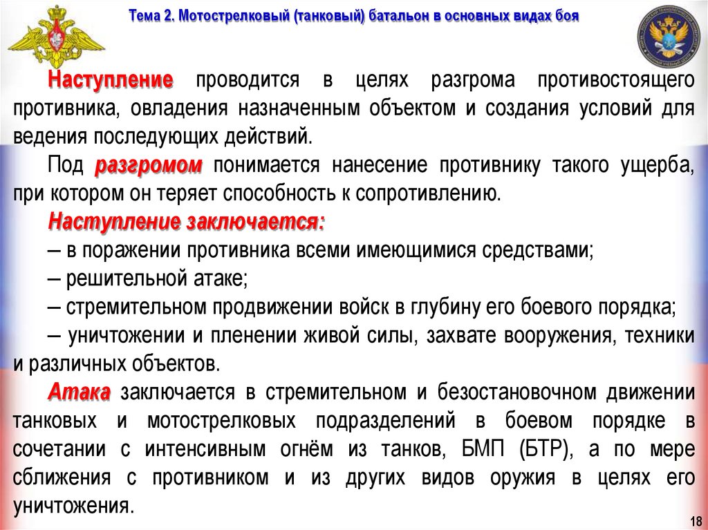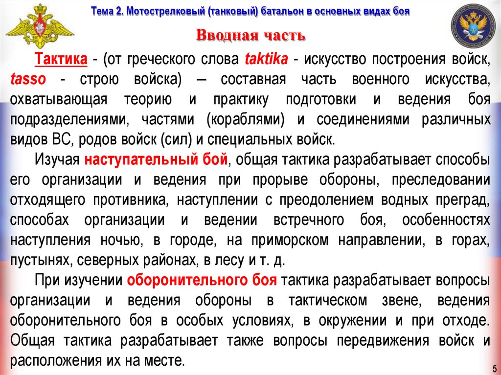 Тема 2. Мотострелковый (танковый) батальон в основных видах бояВводная часть