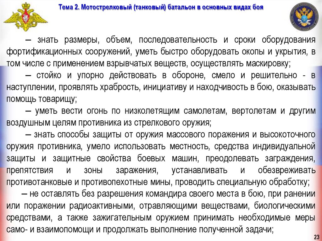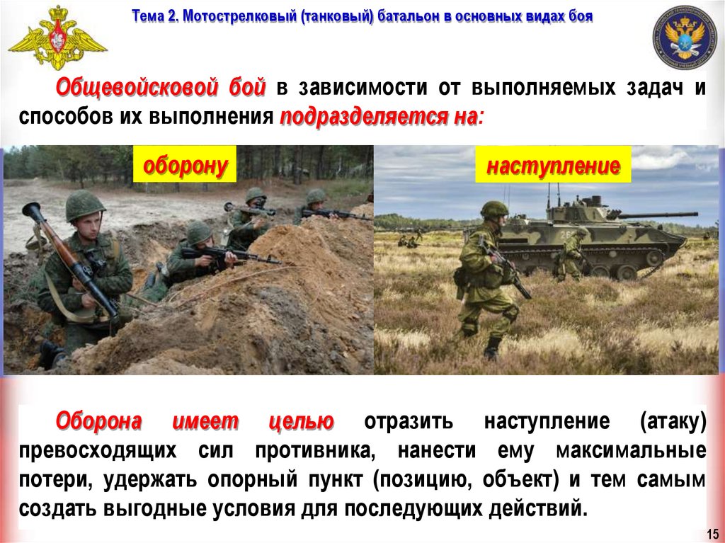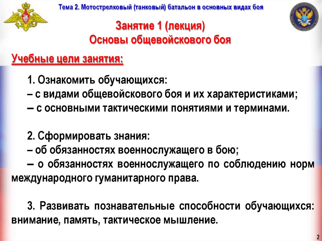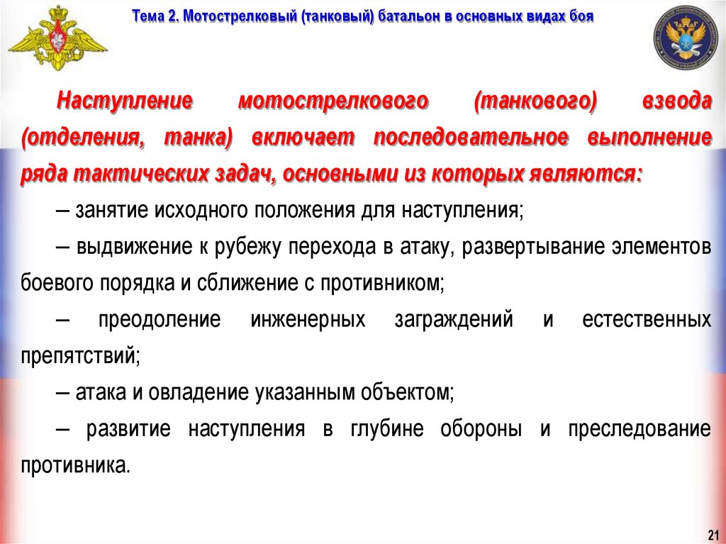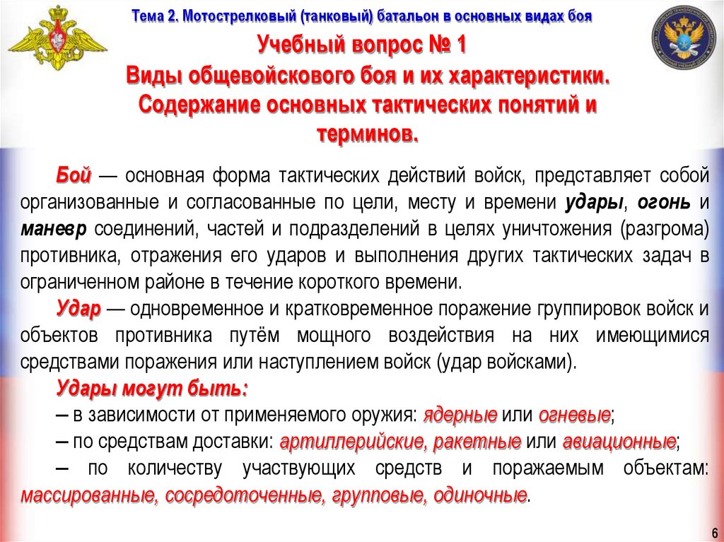 Тема 2. Мотострелковый (танковый) батальон в основных видах бояУчебные вопросы занятия:
