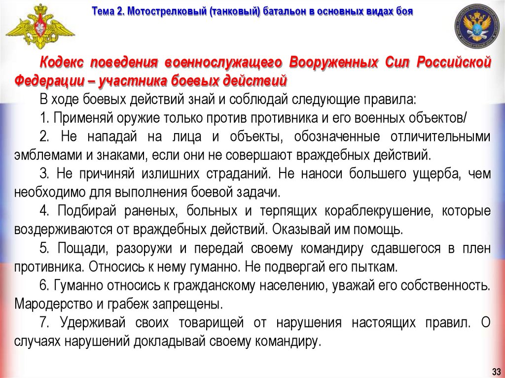 Тема 2. Мотострелковый (танковый) батальон в основных видах бояКодекс поведения военнослужащего Вооруженных Сил Российской