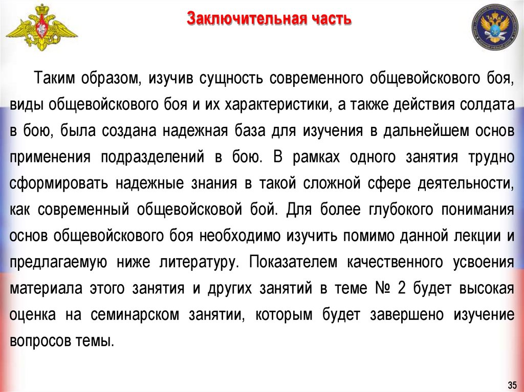 Заключительная частьТаким образом, изучив сущность современного общевойскового боя,
