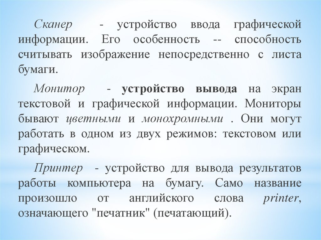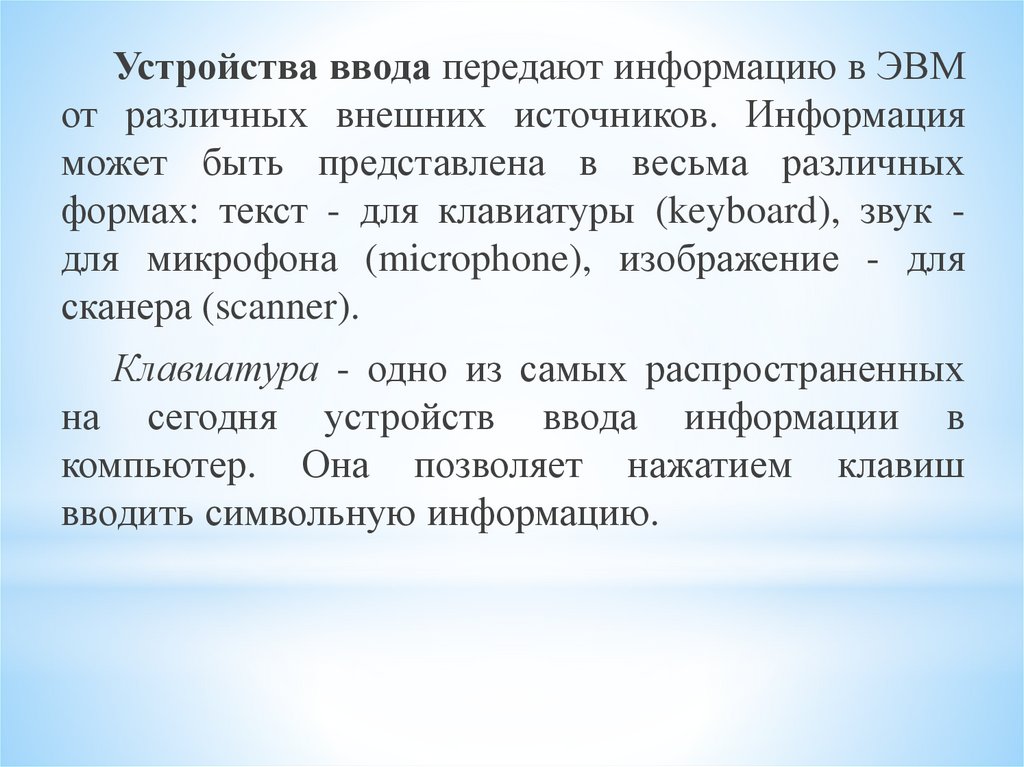 Устройства ввода передают информацию в ЭВМот различных внешних источников. Информация