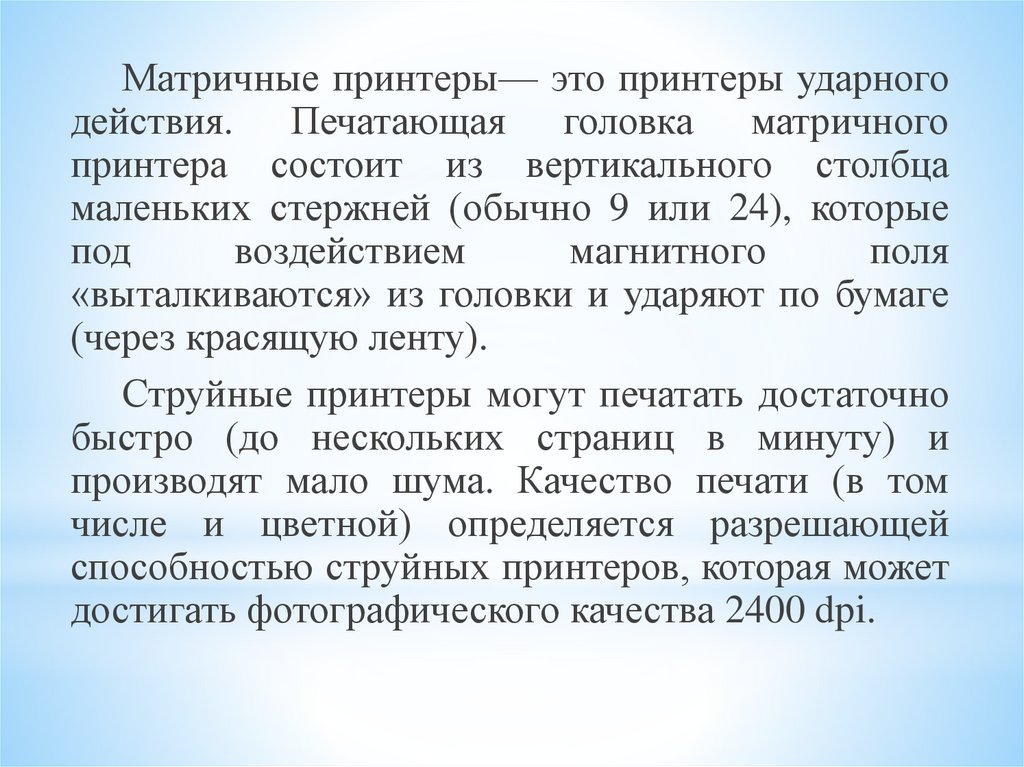 Матричные принтеры— это принтеры ударногодействия. Печатающая головка матричного