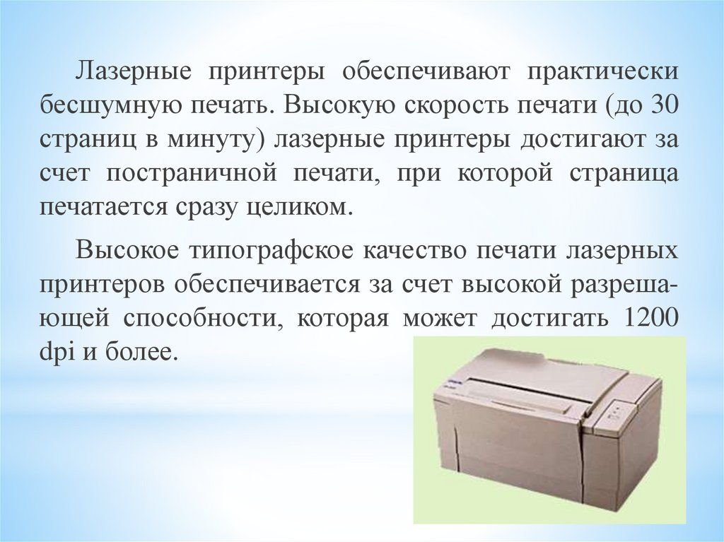 Лазерные принтеры обеспечивают практическибесшумную печать. Высокую скорость печати (до 30