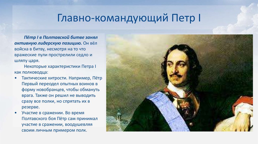Главно-командующий Петр IПётр I в Полтавской битве занял