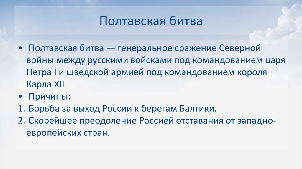 Полтавская битва• Полтавская битва — генеральное сражение Северной