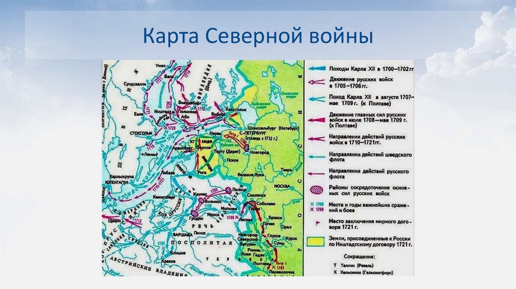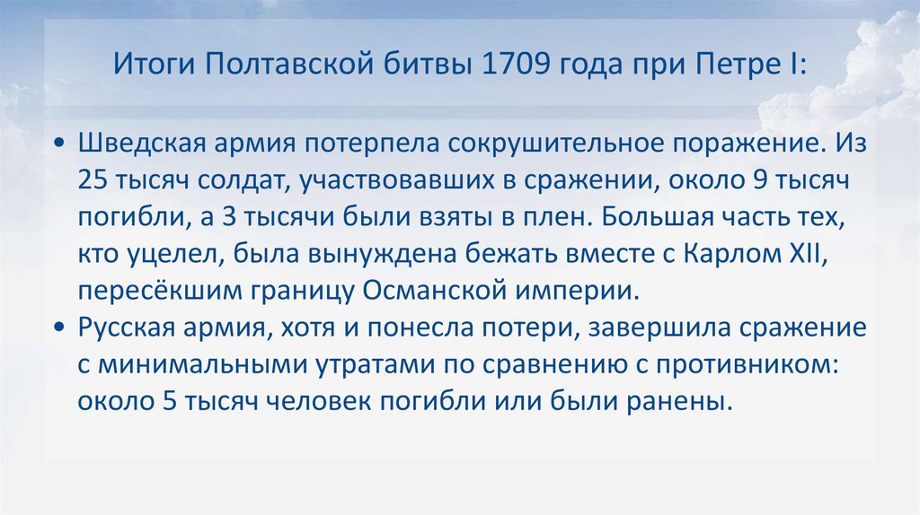 Итоги Полтавской битвы 1709 года при Петре I:• Шведская армия потерпела сокрушительное поражение. Из
