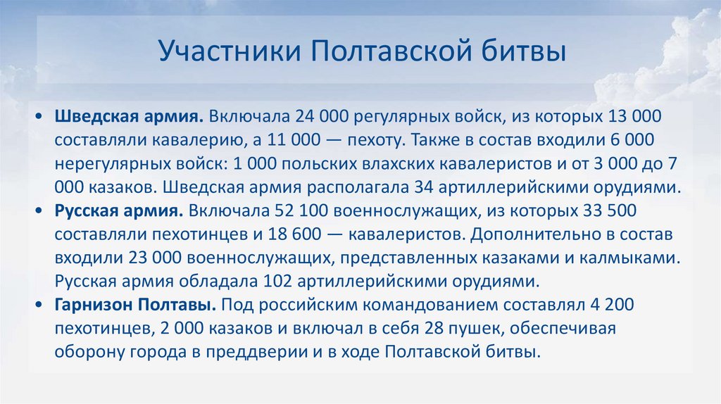 Участники Полтавской битвы• Шведская армия. Включала 24 000 регулярных войск, из которых 13 000