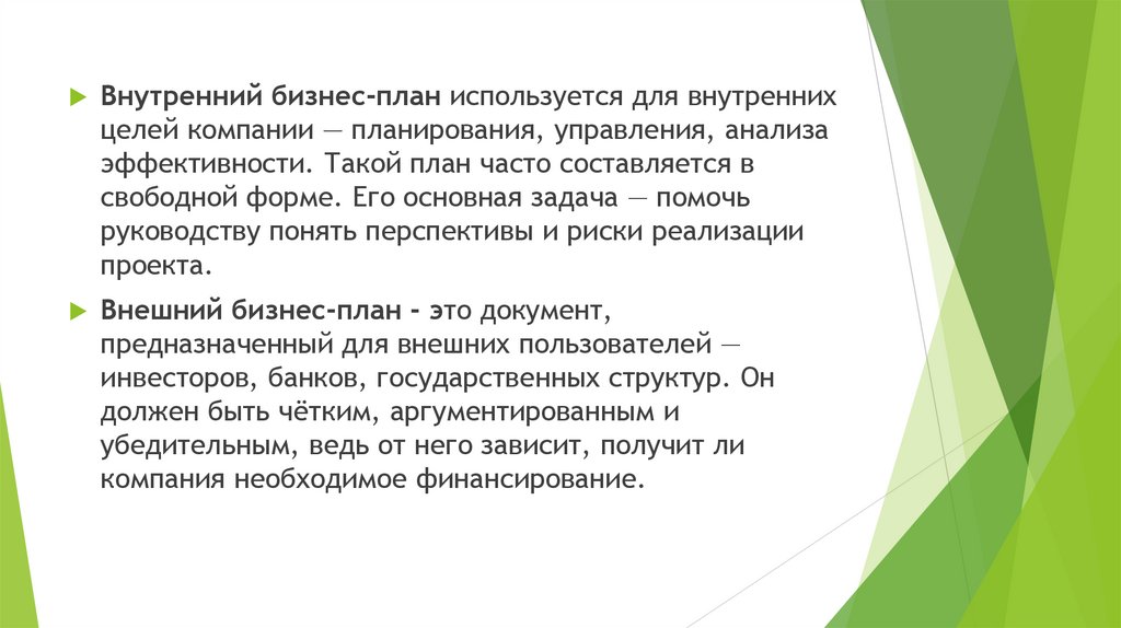 Внутренний бизнес-план используется для внутреннихцелей компании — планирования, управления, анализа