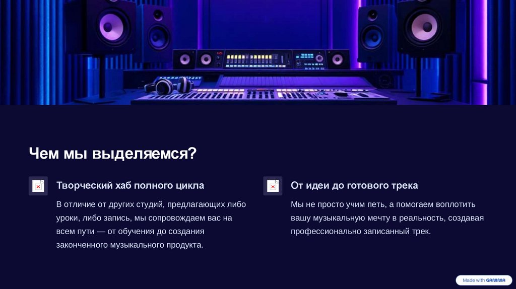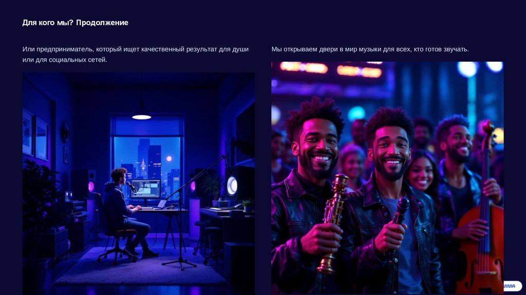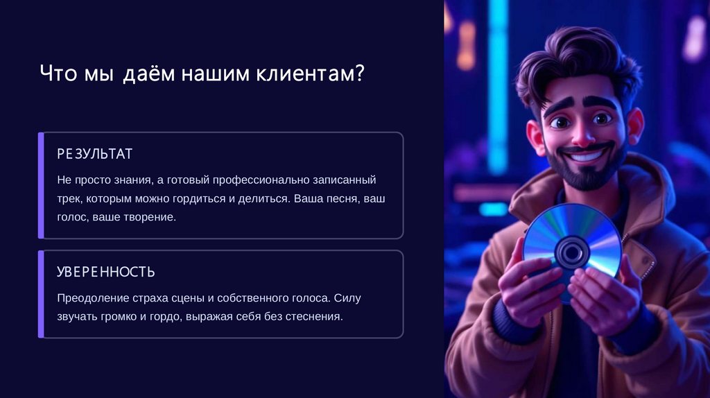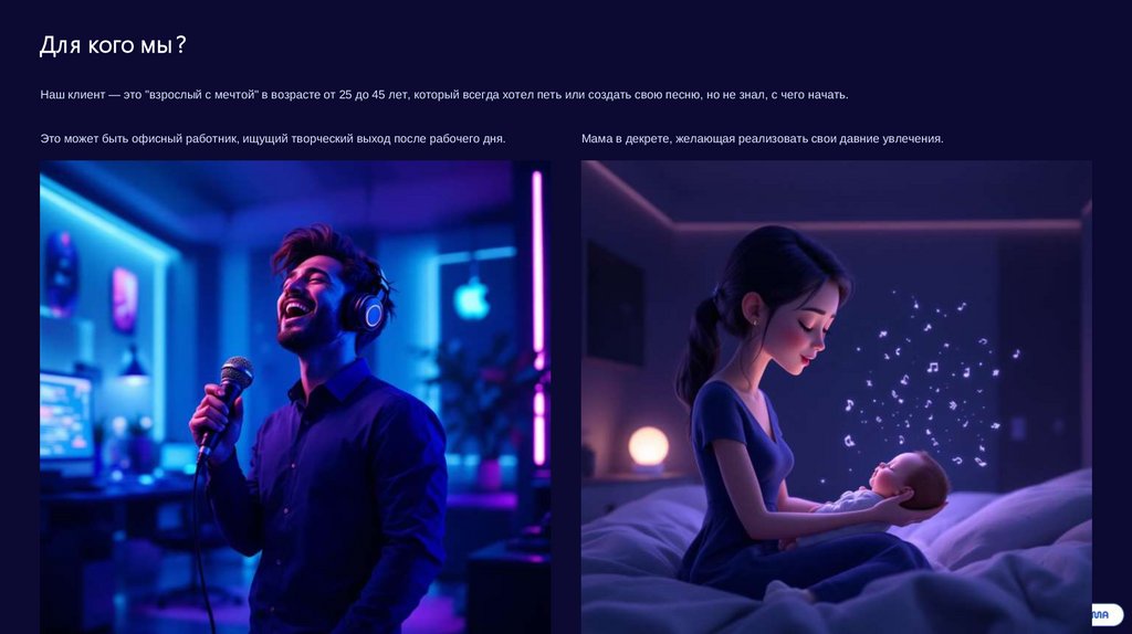 Для кого мы ?Наш клиент — это "взрослый с мечтой" в возрасте от 25 до 45 лет, который всегда хотел петь или создать свою песню, но не знал, с чего начать.