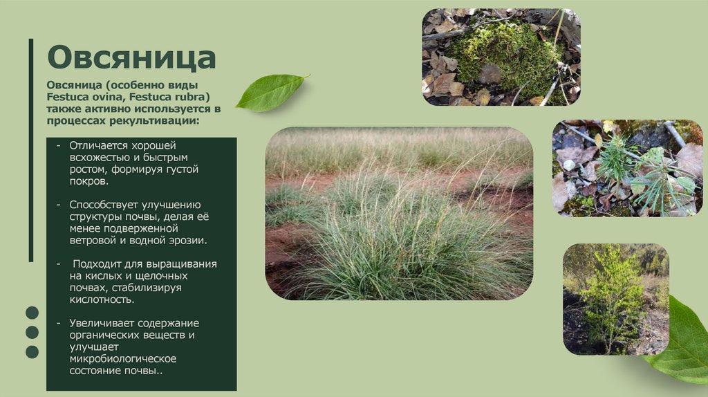 (мхи, овсяница) — для укрепления почвы и