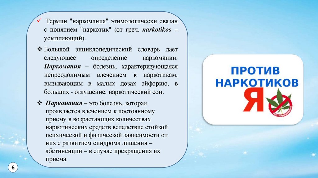 Термин "наркомания" этимологически связанс понятием "наркотик" (от греч. narkotikos –
