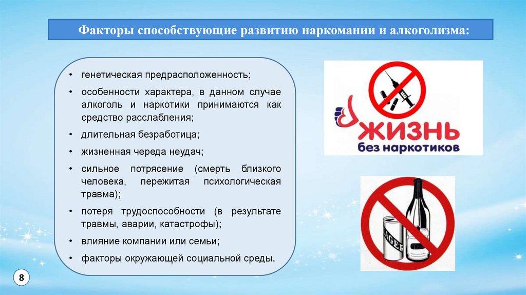 Факторы способствующие развитию наркомании и алкоголизма:• генетическая предрасположенность;