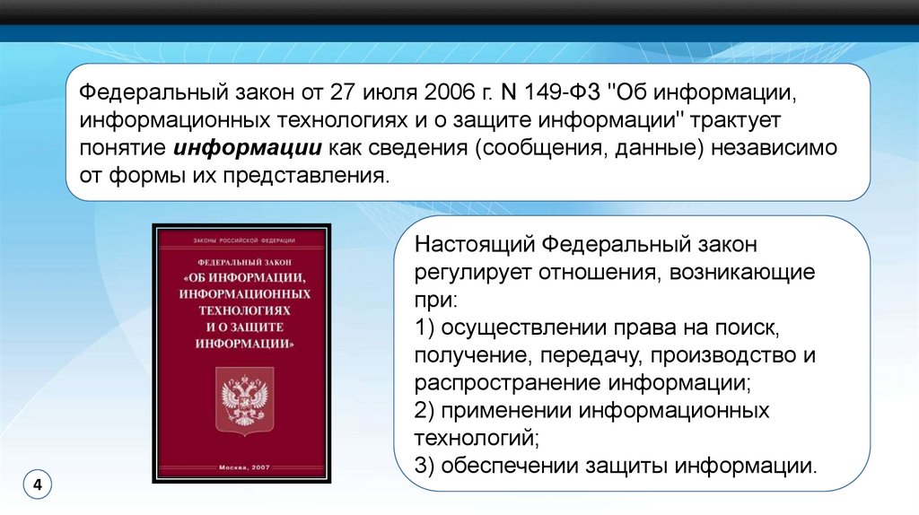 Федеральный закон от 27 июля 2006 г. N 149-ФЗ "Об информации,информационных технологиях и о защите информации" трактует