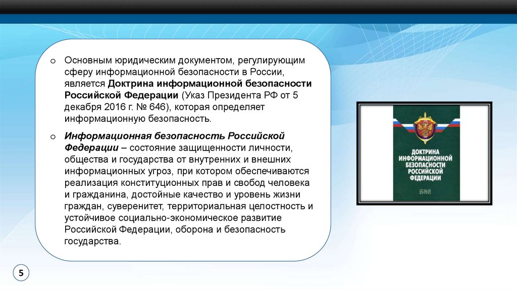 o Основным юридическим документом, регулирующимсферу информационной безопасности в России,