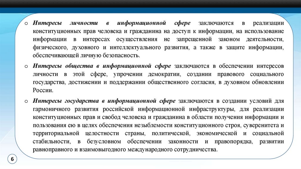 o Интересы общества в информационной сфере заключаются в обеспечении интересов