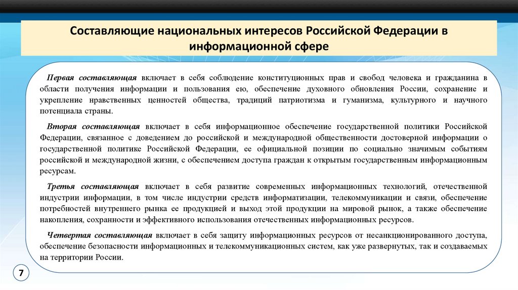 Составляющие национальных интересов Российской Федерации винформационной сфере
