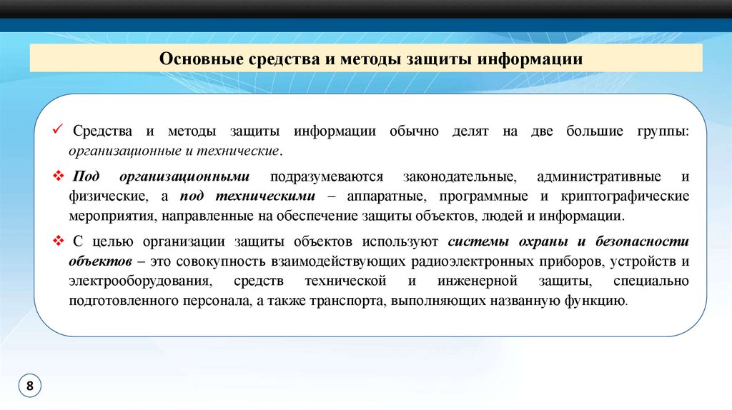 Основные средства и методы защиты информацииСредства и методы защиты информации обычно делят на две большие группы: