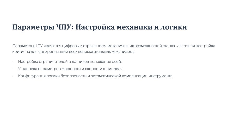 Параметры ЧПУ: Настройка механики и логикиПараметры ЧПУ являются цифровым отражением механических возможностей станка. Их точная настройка
