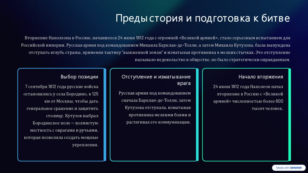 Преды стория и подготов ка к битвеВторжение Наполеона в Россию, начавшееся 24 июня 1812 года с огромной «Великой армией», стало серьезным испытанием для