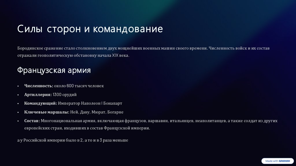 Силы сторон и командованиеБородинское сражение стало столкновением двух мощнейших военных машин своего времени. Численность войск и их состав