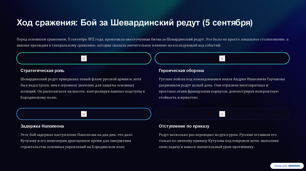Ход сражения: Бой за Шевардинский редут (5 сентября)Перед основным сражением, 5 сентября 1812 года, произошла ожесточенная битва за Шевардинский редут. Это было не просто локальное столкновение, а
