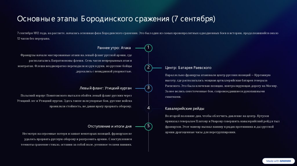 Основ ны е этапы Б ородинского сражения (7 сентября)7 сентября 1812 года, на рассвете, началась основная фаза Бородинского сражения. Это был один из самых кровопролитных однодневных боев в истории, продолжавшийся около