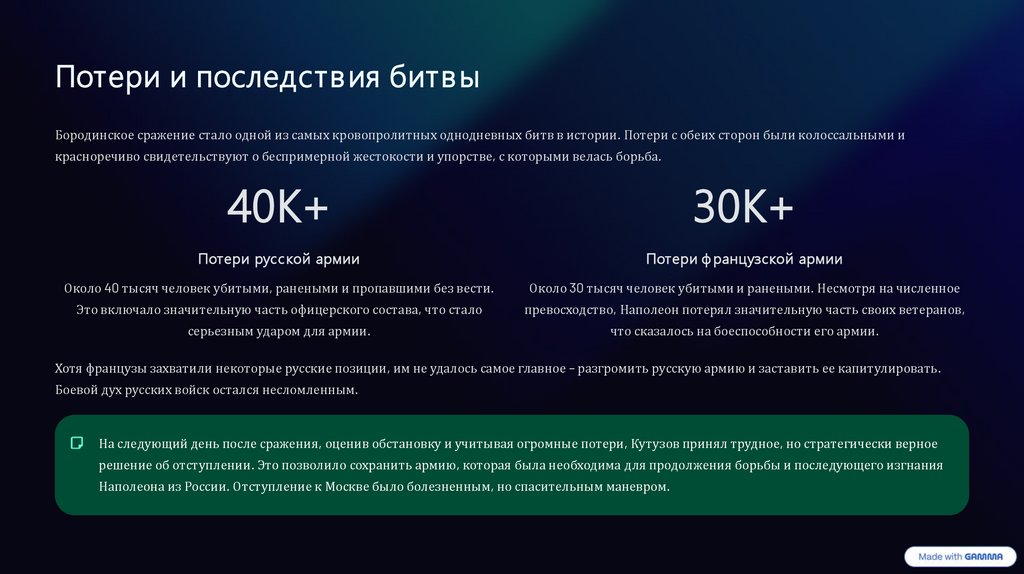 Потери и последств ия битв ыБородинское сражение стало одной из самых кровопролитных однодневных битв в истории. Потери с обеих сторон были колоссальными и