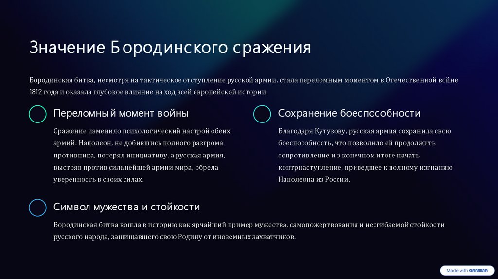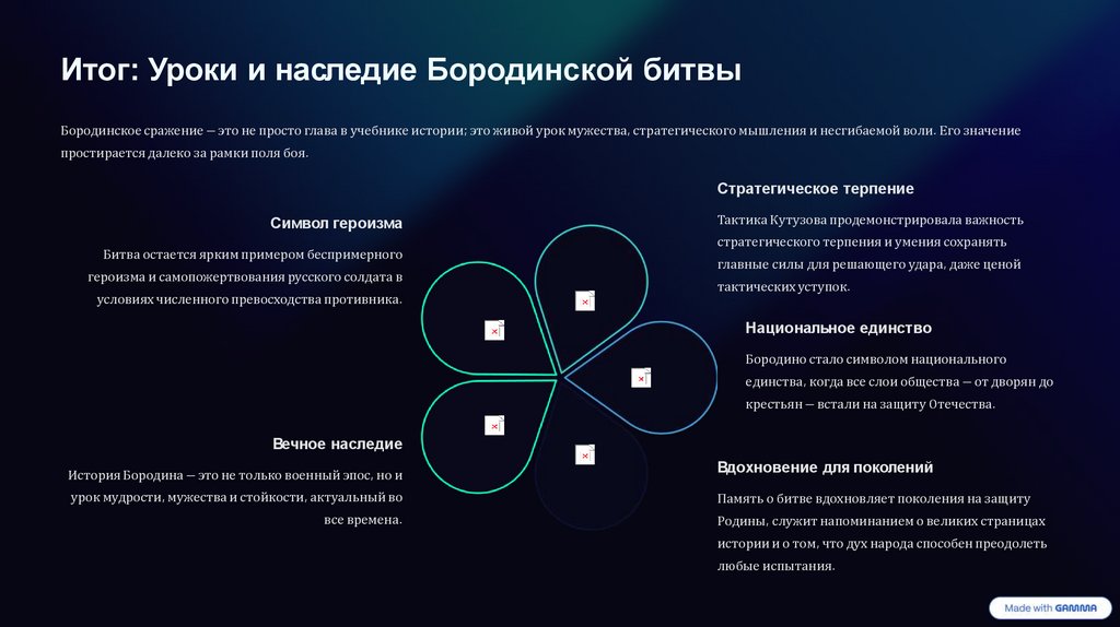 Итог: Уроки и наследие Бородинской битвыБородинское сражение — это не просто глава в учебнике истории; это живой урок мужества, стратегического мышления и несгибаемой воли. Его значение