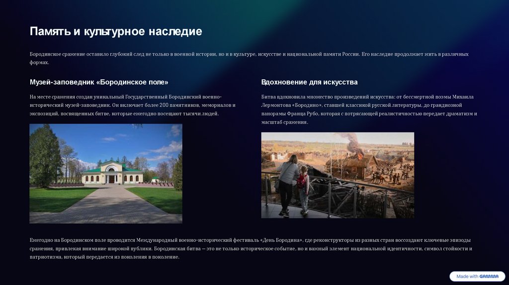 Память и культурное наследиеБородинское сражение оставило глубокий след не только в военной истории, но и в культуре, искусстве и национальной памяти России. Его наследие продолжает жить в различных