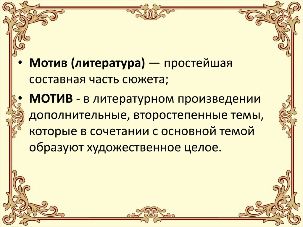 • Мотив (литература) — простейшаясоставная часть сюжета;