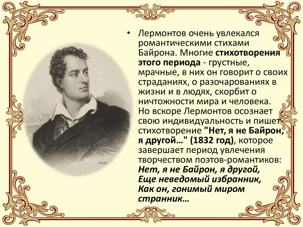 • Лермонтов очень увлекалсяромантическими стихами