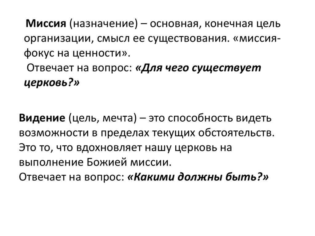 Миссия (назначение) – основная, конечная цельорганизации, смысл ее существования. «миссияфокус на ценности».