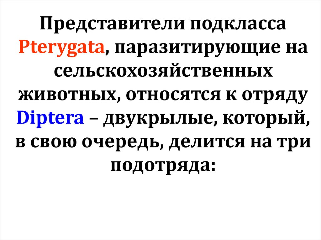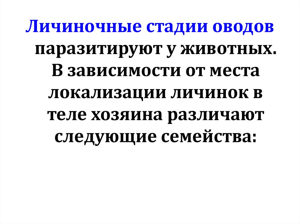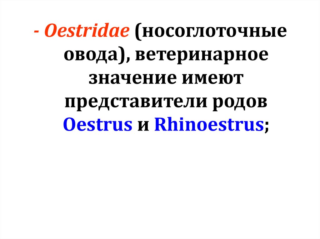 12. Hypodermatidae (подкожные овода), ветеринарное значение имеют представители рода Hypoderma; - Gastrophilidae (желудочные овода)