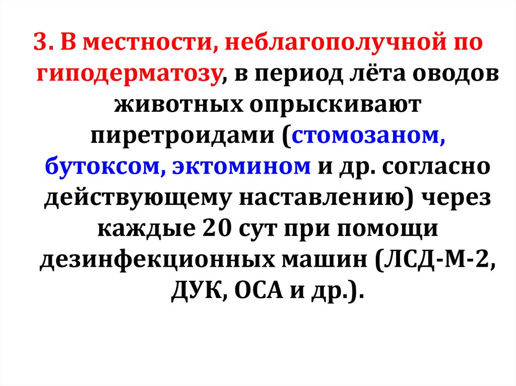 3. В местности, неблагополучной погиподерматозу, в период лёта оводов