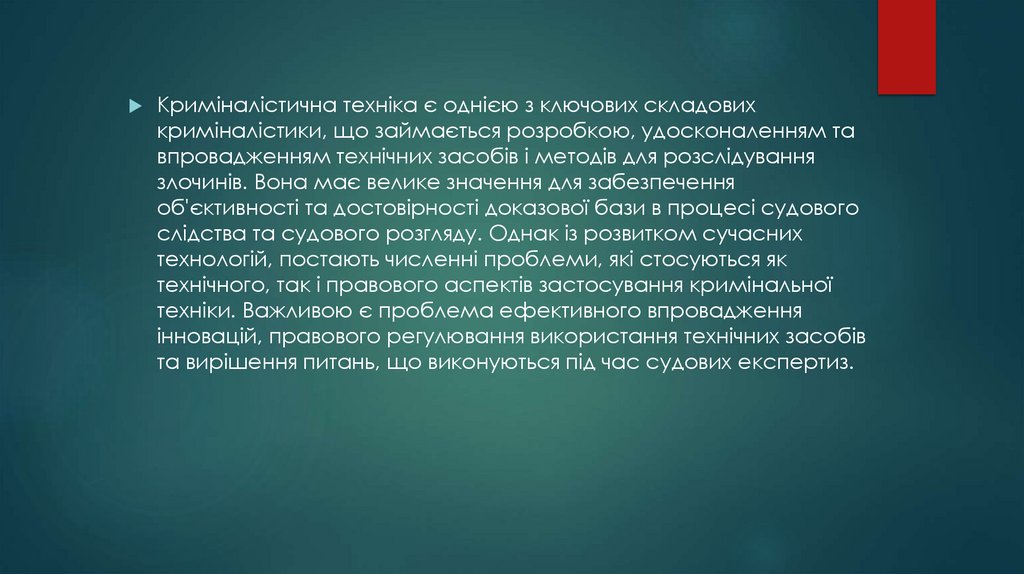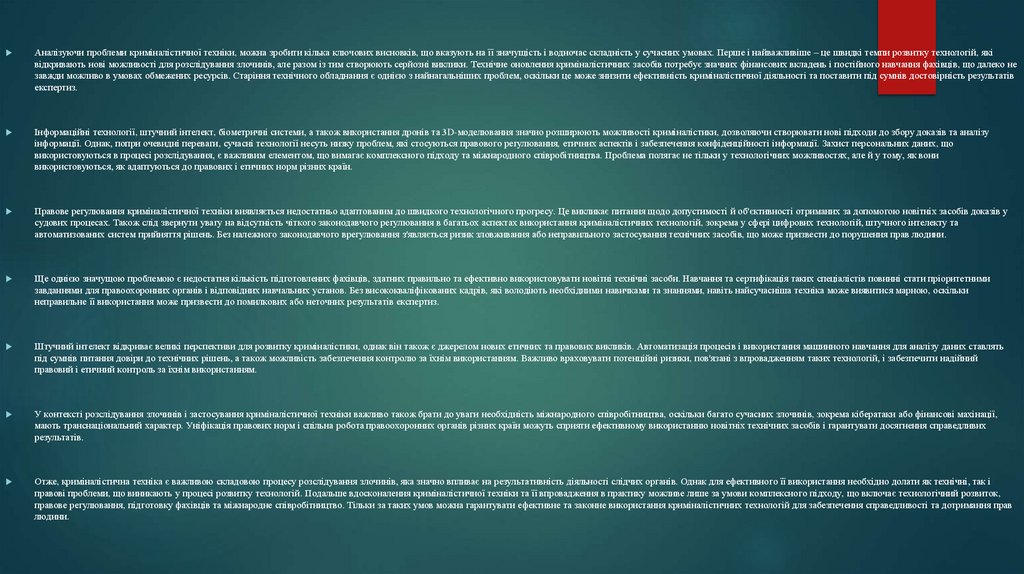 правові проблеми, що виникають у процесі розвитку технологій. Подальше вдосконалення криміналістичної техніки та її впровадження в практику можливе лише за умови комплексного підходу, що включає технологічний розвиток,